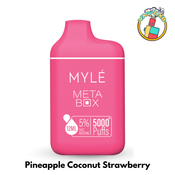 MYLE META Box – Pineapple Coconut Strawberry combines a tropical trio of flavors for a refreshing vape experience. With sweet pineapple, creamy coconut, and juicy strawberry, each puff delivers a smooth and delicious blend. This pre-filled, portable device is designed for convenience, offering a long-lasting battery and a satisfying nicotine hit. Enjoy a taste of paradise wherever you go!